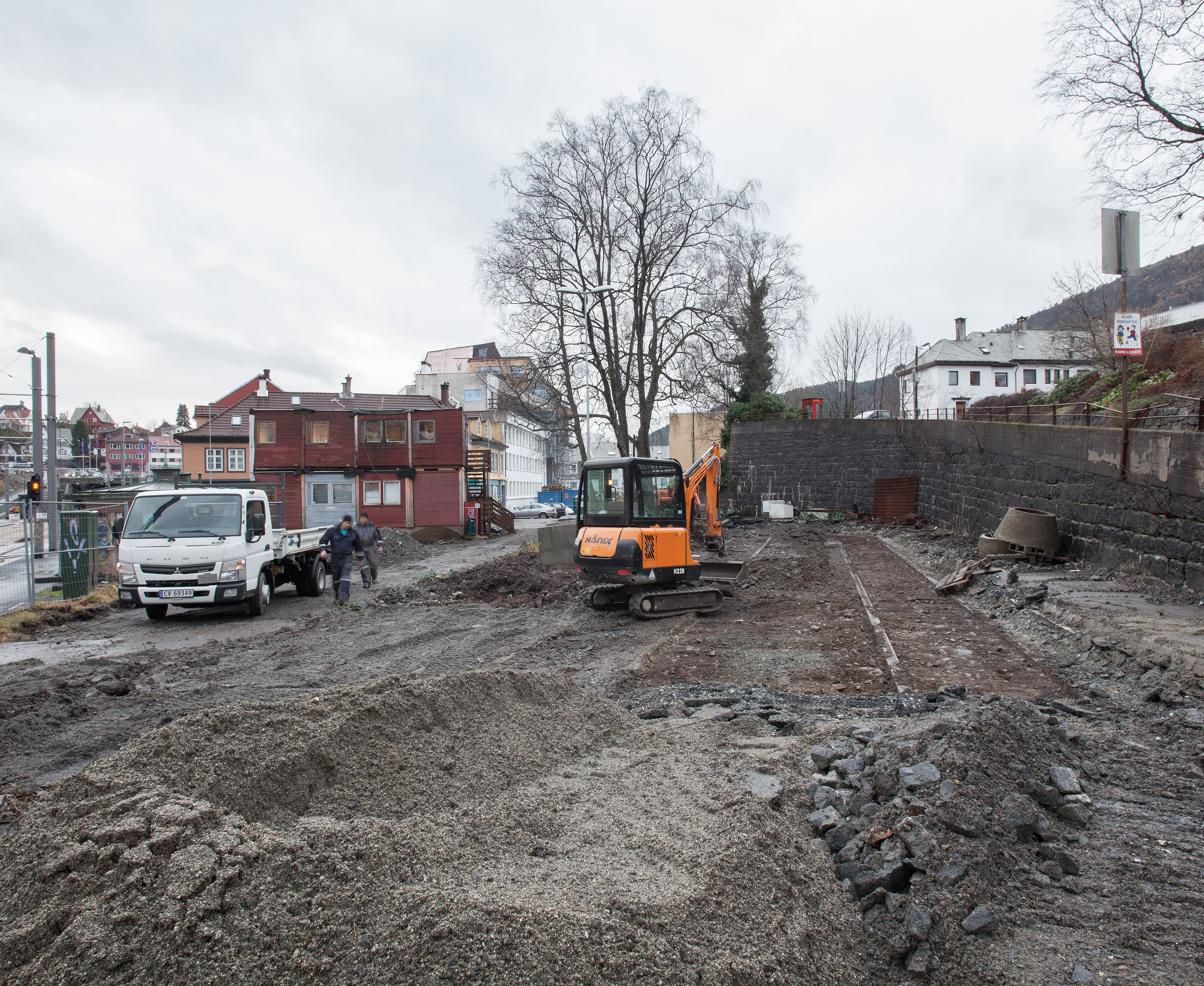 Gamle trikkeskinner avdekkes på Ambrosia Tønnesens plass i forbindelse med opprustning av parken.