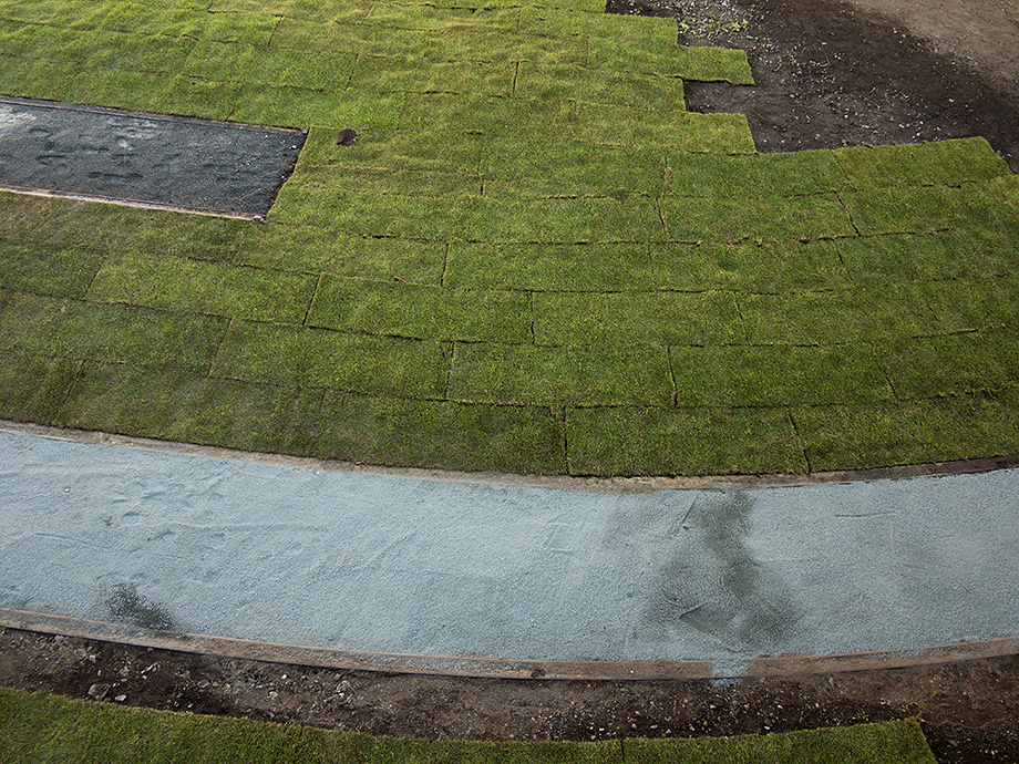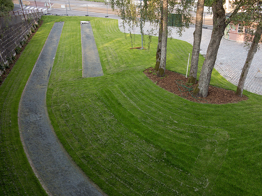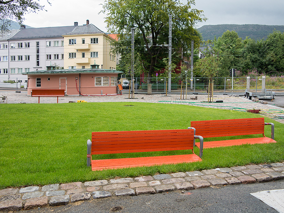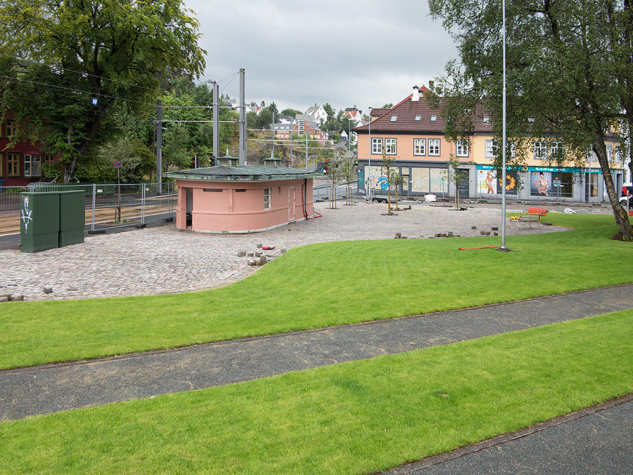 For en måneds tid siden ble det lagt plen, og nå kommer nye benker. Sporveiskiosken har fått ny maling og skal bli kafé.