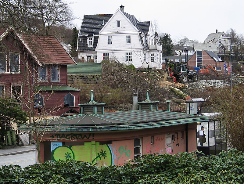 Vi befinner oss like ved den gamle trikkesløyfen på Minde. Til venstre skimtes litt av sporveiskiosken fra 1930-tallet.