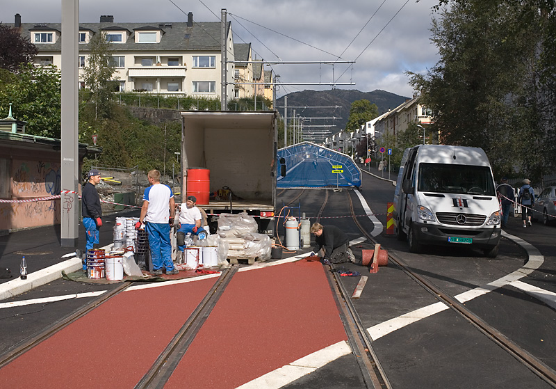 Noen karer fra Hummervoll Industribelegg legger ut rødt dekke der biltrafikken skal krysse bybanen.
