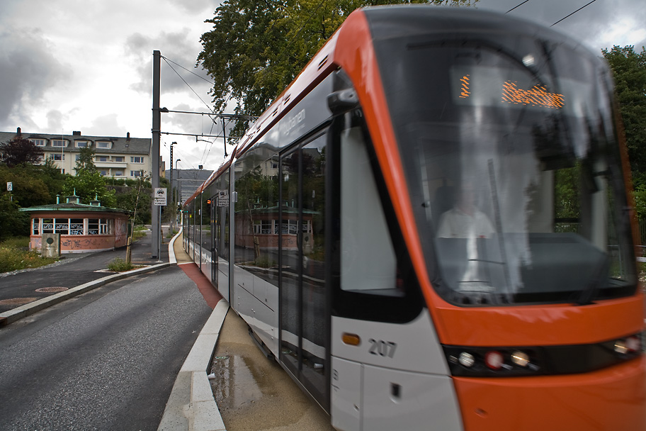 Bybanen passerer den over 75 år gamle sporveiskiosken og kjører inn på Wergeland stasjon.