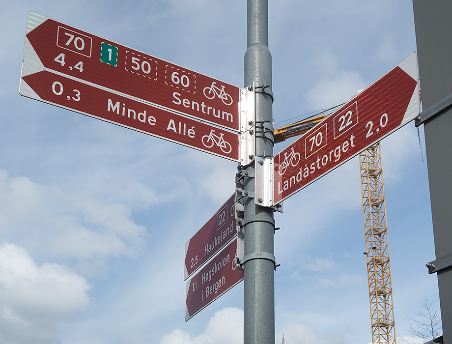 I krysset Storetveitveien/Minde Allé står dette skiltet med informasjon for syklister.