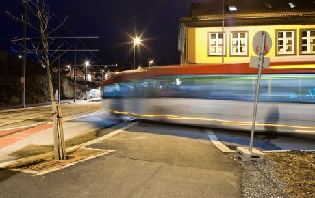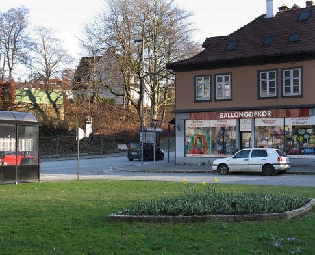 Et lite blikk fra Ambrosia Tønnesens plass, også kalt Trikkesløyfen, opp mot villaen i jugendstil som kan skimtes bak trærne ovenfor bussholdeplassen. De store trærne er en platanlønn og en bøk.