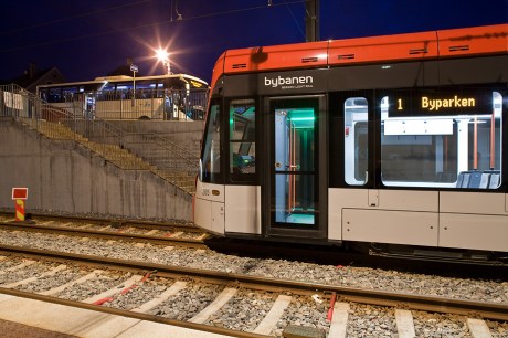Bybaneskinner i forgrunnen.