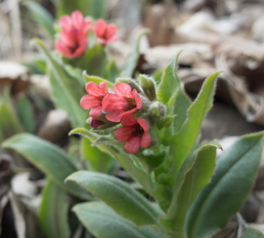 I Minde Allé blomstrer lungeurt (Pulmonaria rubra) nå.