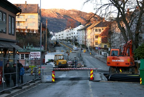 Inndalsveien blir gravd opp for å gi plass for Bybanen som skal gå fra sentrum til Nesttun.