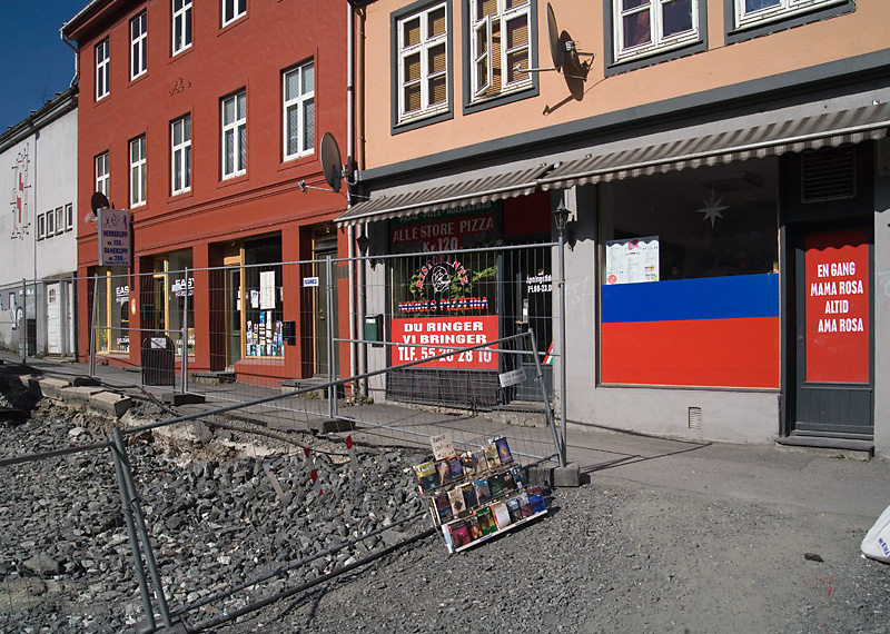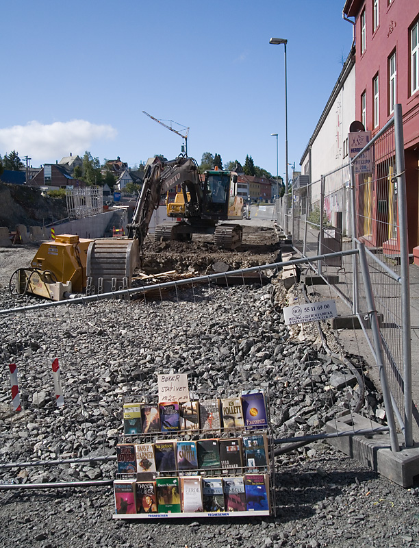 Nydelig lørdag formiddag i Storetveitveien. Anleggsmaskinene har pause, og bruktbøker lufter seg i solskinnet.